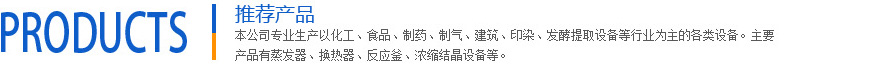 本公司專業(yè)生產(chǎn)以化工、食品、制藥、制氣、建筑、印染等行業(yè)為主的各類設(shè)備。主要產(chǎn)品有發(fā)酵提取設(shè)備,濃縮結(jié)晶設(shè)備,蒸發(fā)器、換熱器、反應(yīng)釜、分離容器、儲(chǔ)罐、熱交換器、冷凝器,全自動(dòng)供水設(shè)備、不銹鋼裝配式水箱、凝結(jié)水回收等各類壓力容器及非標(biāo)產(chǎn)品。其中離心式刮板薄膜蒸發(fā)器獲江蘇省優(yōu)質(zhì)產(chǎn)品。